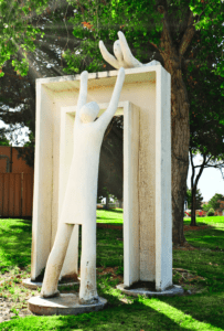Outdoor murals make the best backdrops for selfies, right? Standing in front of angel wings, or next to an oversized postcard, or standing on the brink of a deep canyon…it’s so much fun! To some, that may be the biggest reason and only purpose for having them, but murals are a very important art medium, possibly the best way to make a big impression quickly and with high visibility. I say—we need more of them. “Color Me Cruces” mural, a very popular backdrop, is painted on a private property wall in downtown Las Cruces.Pictured Left to Right: Artists Aaron Valenzuela,Anahy Nunez,and Christina Ballew. photo credit:Downtown Las Cruces Partnership I love the variety of styles in our city’s murals which range from urban street art to historical storytelling to whimsical art. Most are two-dimensional (2-D), but my favorite style is 3-D art murals that trick the eye into seeing something that’s not actually there, like a hand coming out of a wall or a hole in the ground. I would love to see more of this type of art done in Las Cruces. Wouldn’t it be fun to see water cascading down the outdoor staircase at the library? Or possibly a bank of meter boxes camouflaged as slithering rattlesnakes.