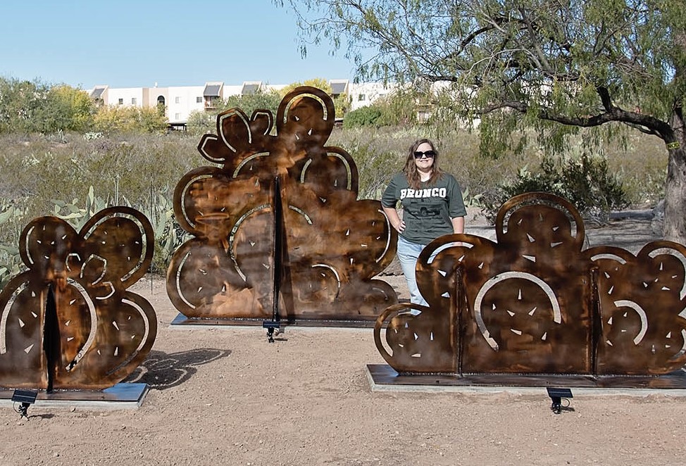 Kayla Blundell, one such artist, won the commission for La Buena Vida Park with her proposed concept for a four-piece sculpture project titled Desert Kinship. The recently installed artwork surpasses the expectations of her design. It’s play with perception is fun, the coppery patina covering the steel shapes flickers in the sun, and glows at night, and the stylized birds and cacti add beauty and interest to a spot where park visitors gather.