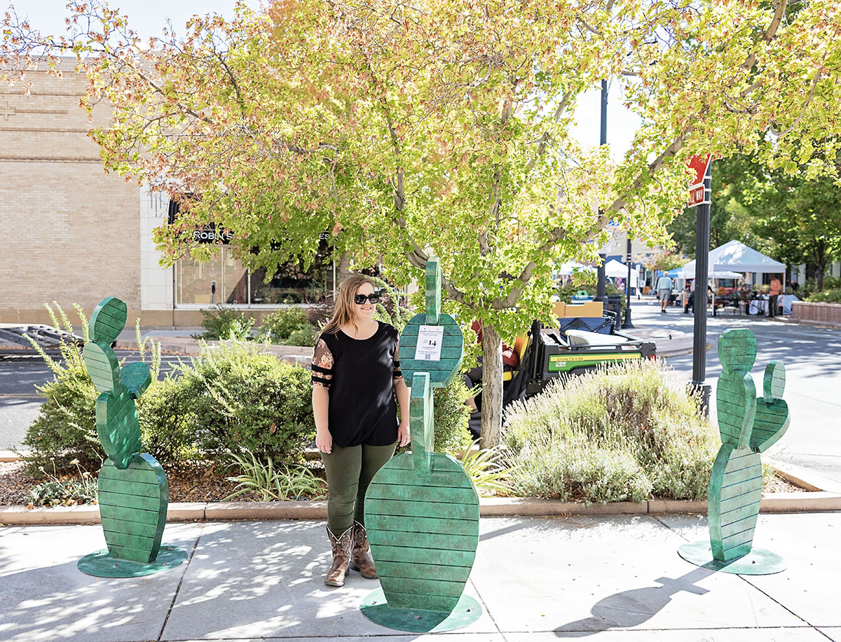 Most recently, I created a set of pedestrian-scaled stylized prickly pears titled Prickly Pear Trio. This grouping of three stylized prickly pear sculptures are currently on display for one year in Grand Junction, Colorado, as part of the 41st annual Art on the Corner Exhibition.