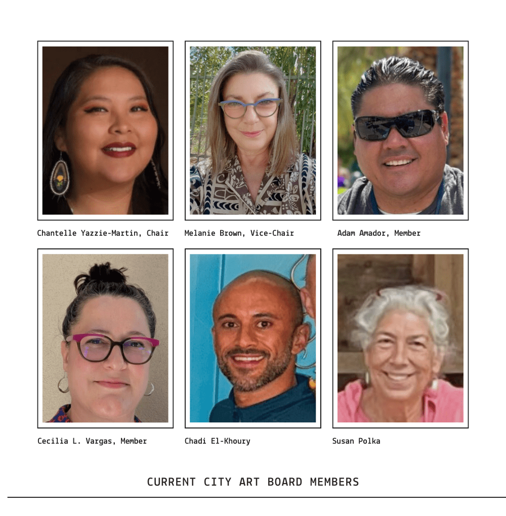 Working with the Parks and Recreation Department, the CAB quickly dove into its purpose of assisting staff with the development of guidelines, programming, and administration of policies, rules and regulations. They begin to make recommendations to the city council regarding acquisition and commissioning of public art installations. The first public artwork commissioned with the CAB’s recommendation was Pride by Karen Yank, located at the East Mesa Public Safety Complex in 2018. In 2019, the CAB selected Debbie Dickinson to design Endless Passage, which is now installed on City Hall’s lobby pillar. Since then, the CAB has recommended many selections for new additions to the City’s collection.