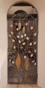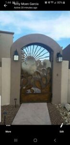 “I’m not sure I even knew what that piece was for,” recalls Ruben, laughing. Thinking back on how he got started making metal art, he says, “I fell in love with welding things in high school. I got certified at Dona Ana Community College and worked as a welder for many years.” Even though welding was his job, Ruben still worked in his home shop on projects that were a little more creative. “I make things from wall art to custom doors,” he said. “My wife Amy is very creative and gives me lots of great ideas.” He credits Amy’s grandmother with getting him started on using a plasma cutter. “I made tables for her in trade for the plasma cutter. She wasn’t using it.”  Amy’s family were the owners of Trophy Country, which is no longer in business.