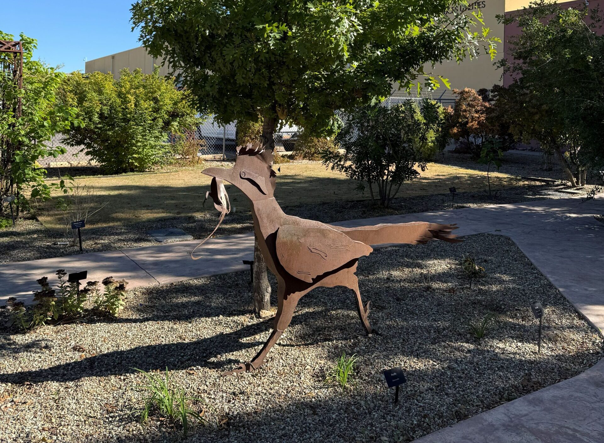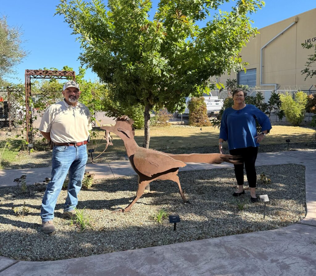 In 2018, Utilities was tasked with landscaping a new median near Love’s Truck Stop on the west side of the city. The request was for water smart materials to be used. Rhonda Diaz, Water Conservation Program Coordinator at Utilities, thought a sculpture of a roadrunner (inspired by the large one at the rest stop) would add a nice touch to the xeriscape of the median. She contracted with a local business, Trophy Country, to create an original art piece inspired by a picture she found of a roadrunner. They delivered exactly what she wanted.