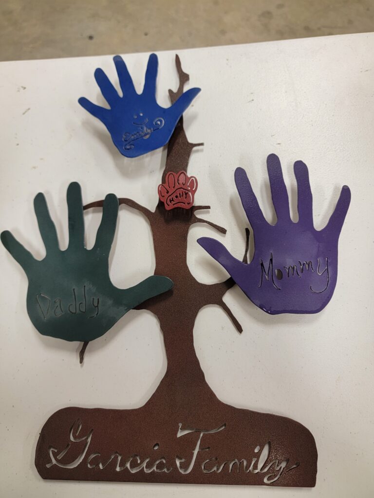 “It’s very relaxing to make things,” explains Ruben. He also appreciates the value of art as a healing force. He tells the story of a neighborhood girl whose dad had passed away unexpectedly. “You could tell this little girl was suffering from the loss, and I felt so bad for her.” He invited her to come into his workshop where he had her put her hand on a piece of metal, outlined it, and cut it out with her signature on it. He called it A Memory That Can’t Be Broken and gave it to her as a gift. “I think that helped her a little, and it inspired me to make the same with my family.”
