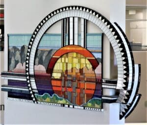 Nagem also explained the structure depicts four abstract figures resting back-to-back symbolizing community. The heads allude to the fossils found in the Robledo Mountains and other surrounding mountains as well as to nature, that binds us together. The purple color is a tribute to the color of the Organ Mountains at sunset as well as the positive feelings allegedly generated by purple amethyst crystals. The globe on top, representing Earth, is covered with ceramic tiles depicting local plants and animals made by Las Cruces and White Sands Missile Range school children in the mid-90’s.