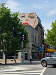 First, the spotted cats are not cheetahs, nor panthers, nor leopards. They are in fact jaguars, as the name of the mural informs us, “Running with the Jaguars” by Santa Fe artist Meg Hachmann. The art piece was commissioned by the Department of Transportation in 2014 as part of their bridge rehabilitation project.