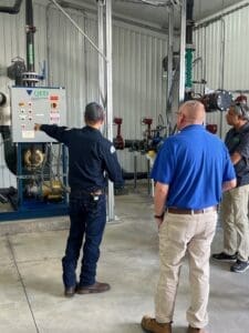 People looking at poster boardsTo protect the public, four city wells were shut down after the discovery. In 2012, two of those wells were reactivated to pump water into the new treatment facility. One well retired in July 2024, the remaining well continues to support treatment operations.